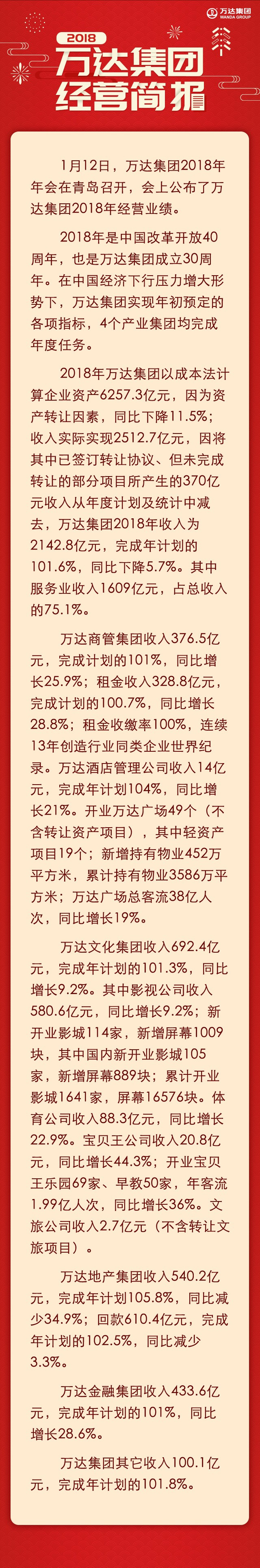 2018年是中國改革開放40周年,也是萬達(dá)集團成立30周年。在中國經(jīng)濟下行壓力增大形勢下,萬達(dá)集團實現(xiàn)年初預(yù)定的各項指標(biāo),4個產(chǎn)業(yè)集團均完成年度任務(wù)。